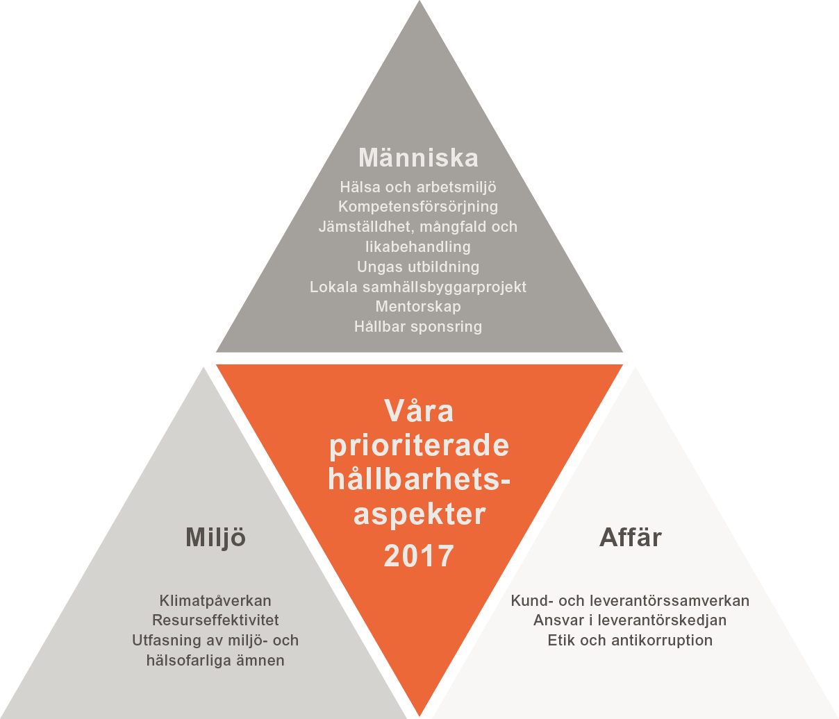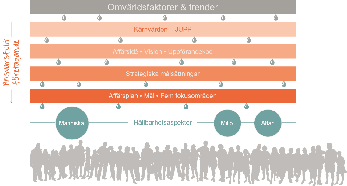 Det strategiska arbetsmiljöarbetet bedrivs på koncern- och affärsområdesnivå, tillsammans med relevant kompetens på samtliga nivåer i organisationer som ansvarar för att omsätta strategin till verklighet.